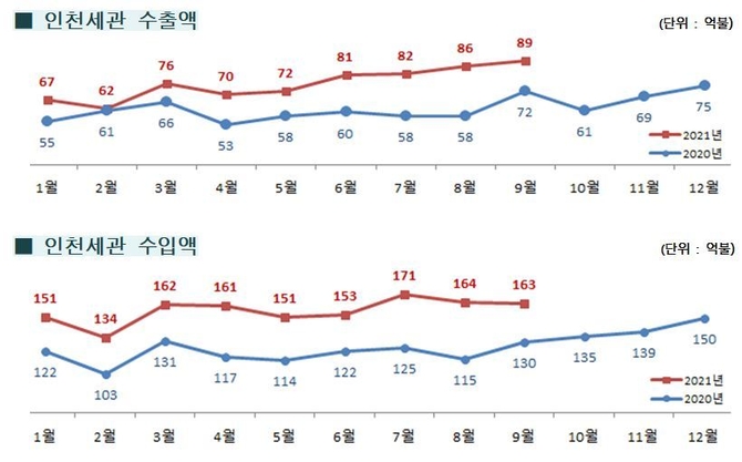 18일 인천본부세관 9월 수출입 동향에 따르면 인천세관을 통한 수출액은 89억불, 수입액은 163억불로, 총 무역액 252억불을 기록했다.