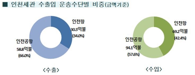 운송수단별 비중을 보면 인천공항이 인천항보다 비중을 더 많이 차지했다. 인천공항 수출은 58.8억불로, 66.0%를 차지했고, 인천항은 30.3억불로 34.0%를 기록했다.