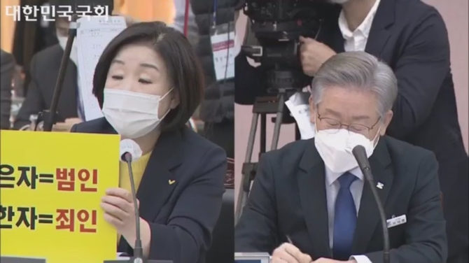 이어 심 의원은 팻말을 들어보였다. 팻말에는 ‘돈받은자=범인, 설계한자=죄인’이라고 적혀있었다. 이에 대해 심 의원은 “이 지사가 큰 도둑에게 다 내주고 작은 확정이익에 집착해 이거라도 얼마냐 이렇게 말하는 것으로국민들은 이해한다”고 말했다.