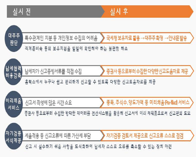 국세청은 증권사로부터 주식거래내역을 전달받아 신고자가 바로 참고할 수 있도록 홈택스에 반영(미리채움 서비스)해 줬기 일일이 친인척들에게 전화를 돌리는 수고를 대폭 덜어줬다.