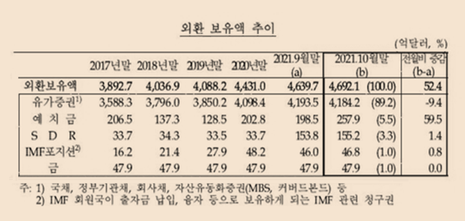 지난달 외환보유액은 1개월 전보다 52억4천만 달러 늘어났다. 국제통화기금(IMF)이 우리나라에 117억 달러 상당의 특별인출권(SDR)을 배분한 지난 8월 52억5천만 달러가 늘어난 것과 유사한 수준이다.