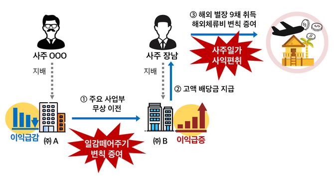 사주는 주력계열사 A의 주요 사업부를 사주 자녀 지배 B사(A사와 동일업종)에 순차적으로 공짜로 넘겨줬다.
