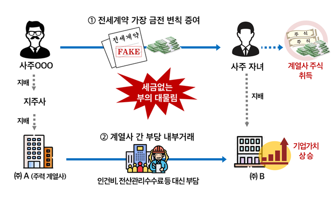 사주는 자녀 소유 주택에 전세로 거주하는 것처럼 거짓으로 계약을 맺고 전세 보증금 명목으로 수십억원을 무상 제공했다. 자녀는 이 돈으로 계열사 주식을 변칙 취득했다.