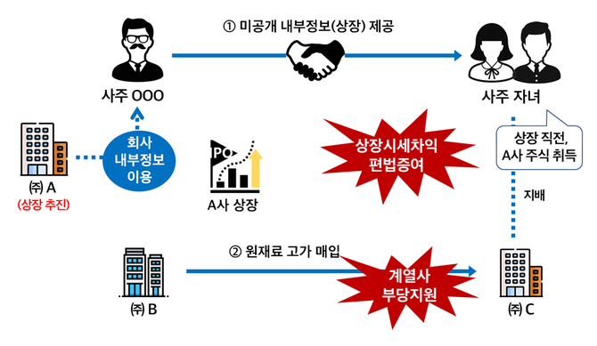 사주 자녀들은 상장 직전 A사의 주식을 취득하였으며, 이후 상장으로 단기간에 주가상승에 따른 막대한 시세차익을 챙겼다.