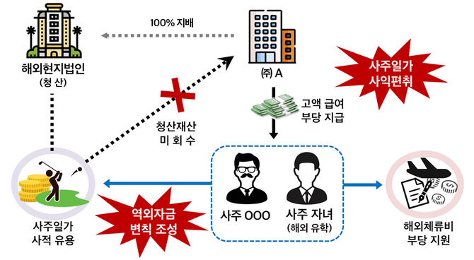 실제 근무 사실이 없는 해외유학 중인 자녀에게 급여 명목으로 수억언을 지급하고, 사주 자녀는 이를 해외 체류비로 사용하는 등 기업이익을 사적으로 편취했다.