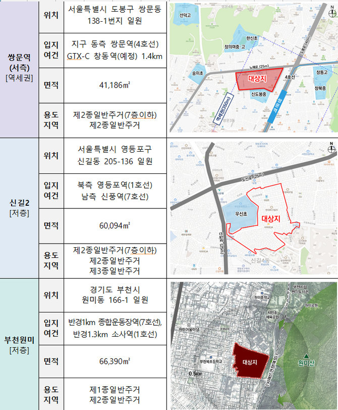 이 3곳은 용도지역 종 상향, 도시규제 완화 등을 통한 고밀 복합개발을 통해 신길2 1300여 세대, 부천원미 1700여 세대, 쌍문역(서측) 1100여 세대의 대단지로 재탄생된다.