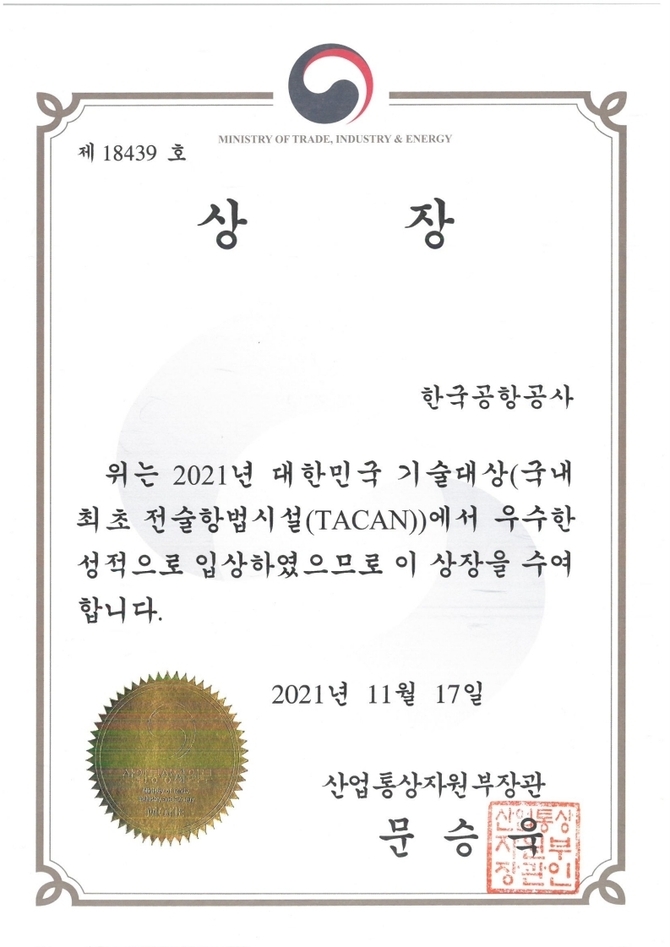 (조세금융신문=홍채린 기자) 한국공항공사는 ‘2021 대한민국 기술대상 시상식’에서 국내 최초로 개발해 상용화까지 성공한 전술항법장비(TACAN)의 기술력을 인정받아 산업통상자원부 장관상을 수상했다고 17일 밝혔다.