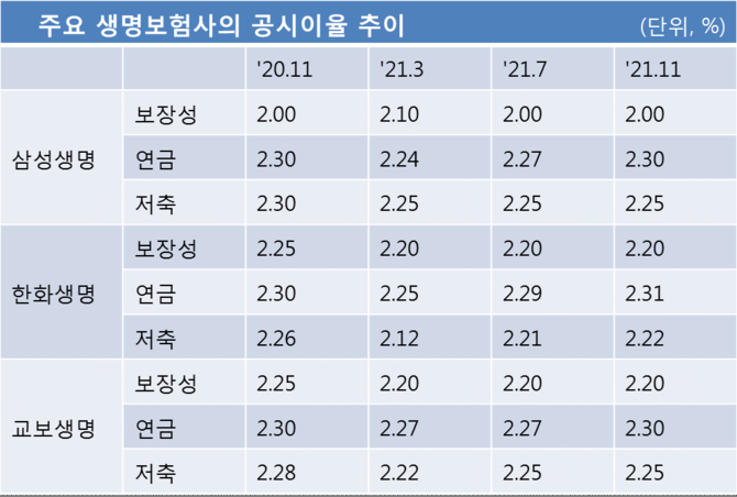 삼성생명과 교보생명은 작년에 이어 올해도 예정이율을 2%로 내려 보험료를 올렸고. 한화생명은 지난해에만 두 차례 예정이율을 인하해 2.0%로 낮췄다.