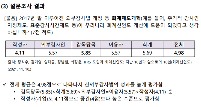 응답자 가운데 기업인들이 있기는 하지만, 회계사회는 신외감법을 만든 사람, 신외감법 운영에 관여된 사람, 신외감법의 수혜자들을 개별 카테고리에 넣고, 그것의 평균점수를 단순 가산평균하여 발표했다. 전체 응답자 중 반대할 만한 사람들의 비중이 작아지는 구조인 셈이다.
