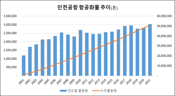 코로나19 장기화에 따른 항공화물수요의 증가세에 힘입어 지난 11월 26일 기준 인천공항의 항공화물 물동량은 개항 이후 최초로 300만 톤을 달성했다. 아울러 지난 7월 27일에는 누적 항공화물 5천만 톤을 달성한 바 있다.