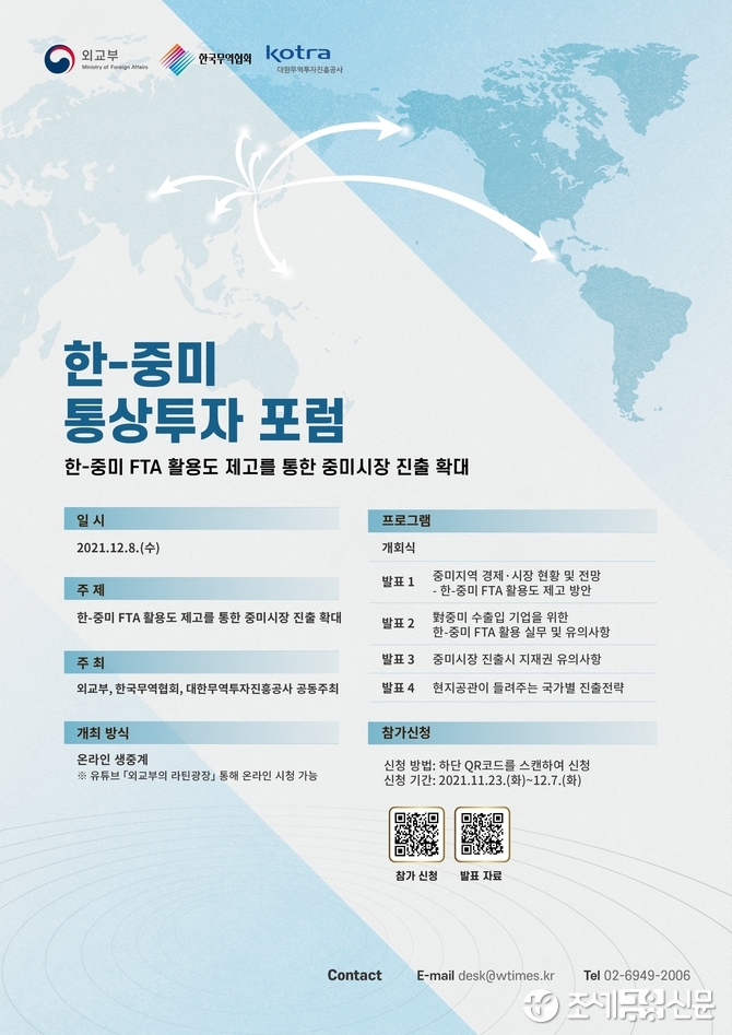 (조세금융신문=최주현 기자) 외교부는 한국무역협회 및 대한무역투자진흥공사와 함께 오는 8일 오전 화상으로 '한·중미 통상·투자 포럼'을 개최한다고 6일 밝혔다.