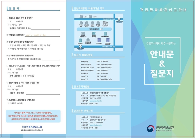 이에 인천세관은 개인화물을 통관하는 사람이 정확하게 수입신고를 할 수 있도록 한국어를 포함해 △영어 △ 중국어 △ 베트남어 △러시아어 등 10개 국어로 된 개인화물 세관신고 안내문을 제작해 관세무역개발원 인천공항지사, 인천공항 관세사회, 항공사 화물부서 등에 배포했다.