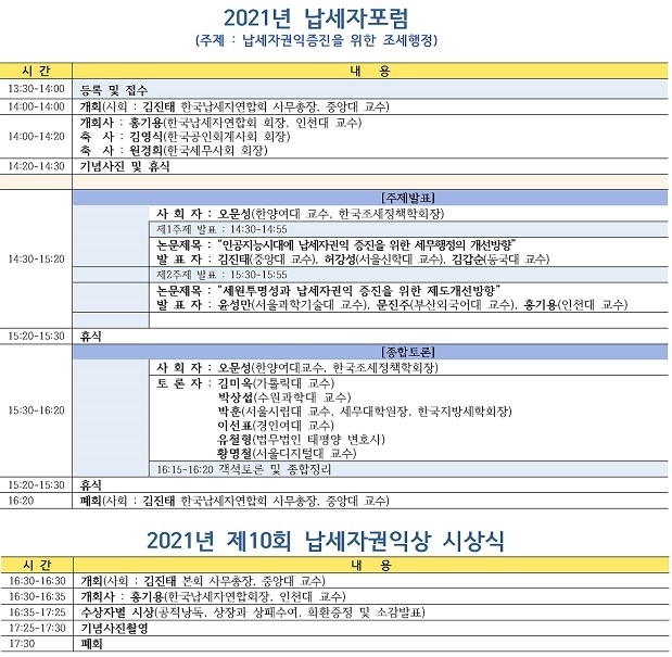 한편, 이날 포럼 주제 발표와 토론 이후에는 2021년 제10회 납세자권익상 시상식이 추가로 진행된다.