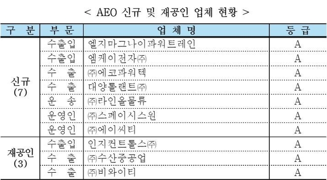 이번에 신규로 공인 받은 업체들은 엘지마그나이파워트레인‧엠케이전자‧에코파워텍‧라인올물류‧스페이시스원‧에이씨티다. 인지컨트롤스‧수산중공업‧비와이티는 재공인을 받았으며 각각 관세청의 법규준수, 내부통제시스템, 재무건전성, 안전관리 등 공인기준에 대한 심사를 거쳐 AEO 자격을 얻게 됐다.