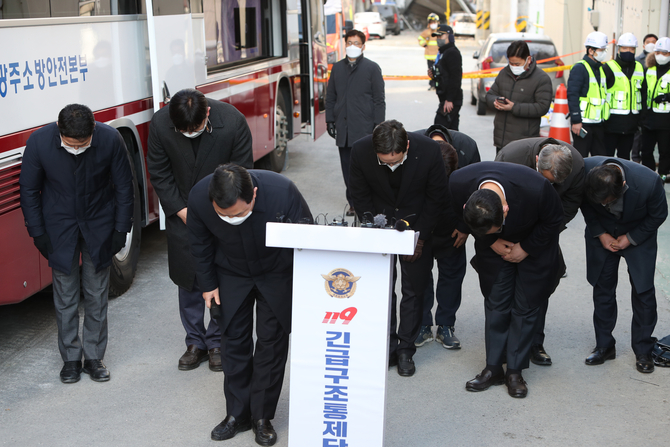 유병규 대표이사가 12일 오전 10시 광주 서구 화정동 사고 현장 소방청 사고대책본부 인근에서 이같은 사과문을 발표했다.