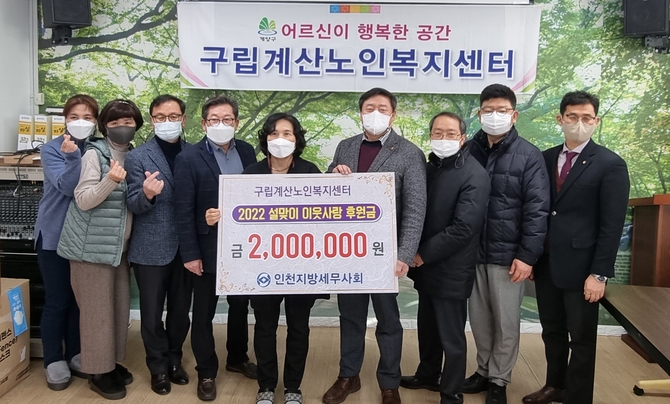 (조세금융신문=이지한 기자) 인천지방세무사회(회장 김명진)는 설 명절을 앞두고 19일 인천 계양구에 자리한 구립계산노인복지센터를 방문해 소외계층과 어려운 이웃을 돕는데 써달라며 회원들이 모금한 성금 200만원을 전달했다.