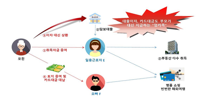 자녀 A, B는 부친의 사업장에 직원으로 등록돼 높은 급여를 챙겼지만, 실제로는 일한 적이 전혀 없으며, 부친 명의의 신용카드를 이용하여 호화 사치생활을 누리는 등 세금 탈루를 횡행했다.