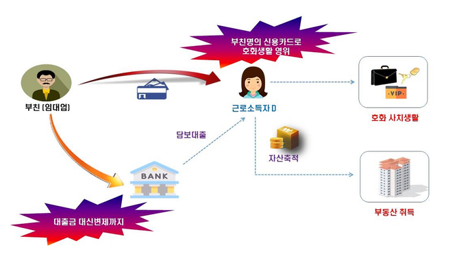 국세청은 D에 대한 자금출처조사 결과 D의 수십억원대 부동산 대출금은 부동산 임대업자인 부친이 대신 갚아줬다는 것을 확인했고, 동시에 D가 생활비는 부친 신용카드로 쓰면서 본인 및 배우자의 소득은 모두 저축해 자산에 활용하는 등 변칙 증여 혐의를 확인했다.