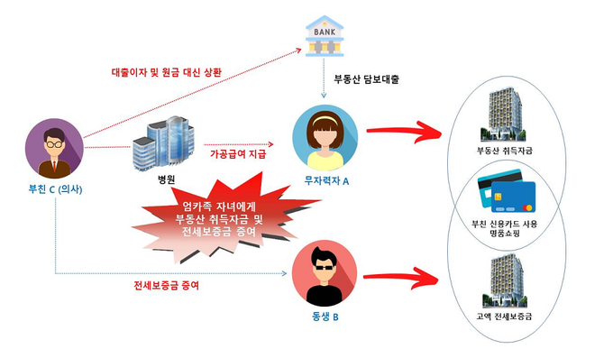 C는 편법으로 자녀들의 아파트 취득자금과 오피스텔 전세보증금 등을 증여해 자녀들의 세금탈루를 돕고, 자녀들이 주택 등을 매입하기 위해 대출한 돈을 대신 갚아줬다.