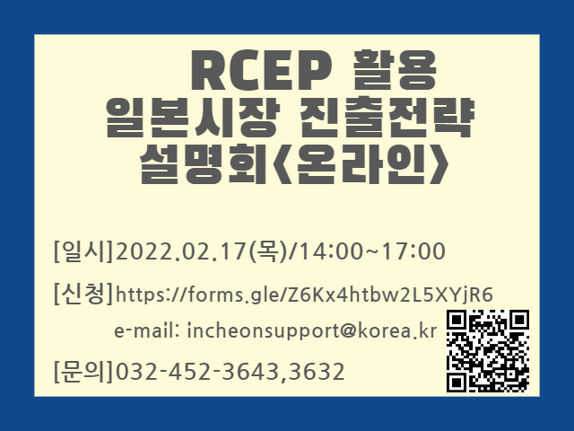 (조세금융신문=홍채린 기자) 인천본부세관은 경기FTA활용지원센터와 공동으로 지난 1일 발효된 역내포괄적경제동반자협정(RCEP)에 일본 수출기업의 활용도 제고를 위해 'RCEP 활용 일본시장 진출전략 설명회'를 17일 개최한다.