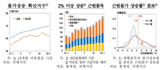 물가가 2% 이상 오른 품목의 수도 지난해 1월 132개에서 올해 1월 239개로 급증했다. 한은은 최근 물가 상승 양상의 특징으로 우선 물가 상승 압력이 근원품목으로까지 확산하는 점을 꼽았다. 2% 이상 오른 근원품목의 수는 올해 1월 150개로 1년 전(67개)의 두 배를 넘어섰다.