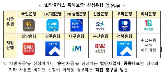 이날부터는 희망플러스 특례보증을 신청할 수 있는 은행이 기존 8곳(국민·기업·농협·신한·우리·하나·부산·대구은행)에서 11곳(경남·광주·전북은행 추가)으로 확대된다.