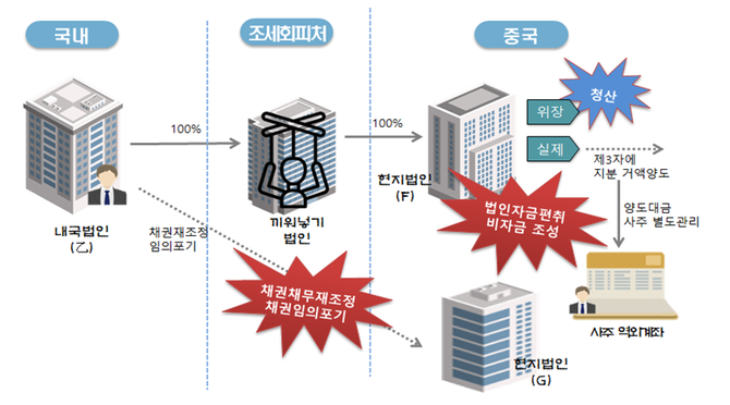 乙법인은 중국에 현지법인 F사를 설립하면서 조세회피처 법인을 끼워넣어 F사를 간접 지배하는 형식으로 투자구조를 복잡하게 설계했다. 이 회사에 거액의 회삿돈을 유출해 횡령, 탈세범죄를 통한 거액의 부를 착복하기 위해서다.