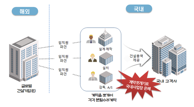 국내에서 6개월 이상 장기간 공사를 수행하고 있음에도 하나의 건설 건을 업체 이름만 여러 개 동원해 공사계약을 쪼개는 수법으로 핵심기능을 은폐하고 고정사업장을 회피했다.