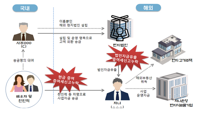 자녀 △△△은 기업 운영비 등 사업자금으로 사용하고 남은 자금으로 현지에서 고가 자가주택을 사들였고, ㅇㅇㅇ은 배우자 및 친인척 명의로 해외 자녀에 개인 이전거래 등의 명목으로 수년에 걸쳐 사업자금을 송금하고 증여세 신고, 납부를 회피했다.