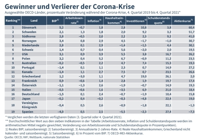 스페인 등 남유럽국가는 여행금지에 따른 지출 감소에 타격이 컸다고 연구소는 분석했다. 독일과 같은 산업국가도 세계적 공급망 병목 현상과 원료난, 에너지 가격 급등으로 타격을 입었다.