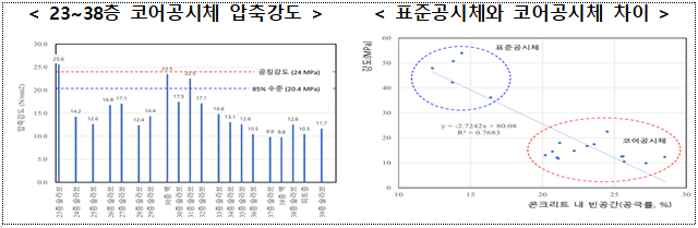 또 콘크리트 품질도 붕괴에 영향을 줬다. 조사위에 따르면 붕괴 건축물에서 채취한 콘크리트 시험체의 강도시험 결과 17개층 가운데 15개층 시험체가 설계기준강도의 85% 수준에 미달됐다. 콘크리트 강도 부족은 철근과 부착 저하를 유발해 붕괴 등에 대한 건축물의 안전성 저하로 이어진 것.