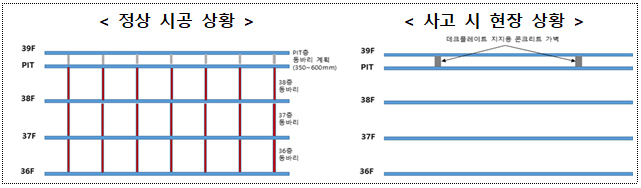 이번 광주 아이파크 사고원인은 ▲39층 바닥 시공방법과 지지방식을 당초 설계도서와 다르게 임의 변경 ▲PIT층에 콘크리트 가벽을 설치 ▲PIT층 하부 가설지지대(동바리)는 조기 철거 ▲콘크리트 저품질 등이다.