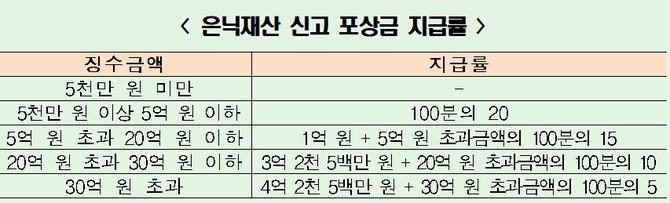 고액체납자의 은닉재산을 신고한 사람은 징수금액 등에 따라 최대 30억원의 포상금을 받을 수 있다.