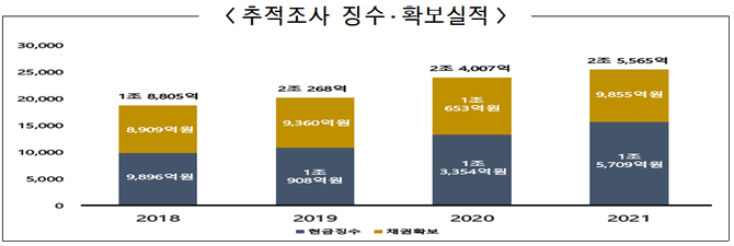 국세청 추적조사 현금징수 실적은 2018년 9896억원, 2019년 1조908억원으로 최초로 1조원대를 넘겼으며, 2020년에는 1조3354억원으로 늘어났다.