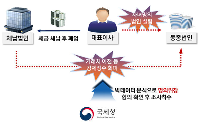 국세청은 빅데이터 분석(동종업종·장소 및 거래처 일치 여부 등)을 통해 F 법인의 모든 자산과 부채, 거래처 등을 G 법인이 사실상 승계한 사실을 확인해 명의위장 혐의를 확인, 재산은닉에 대해 사해행위 취소소송 제기하고 고발 등 범칙처분을 검토하고 있다.