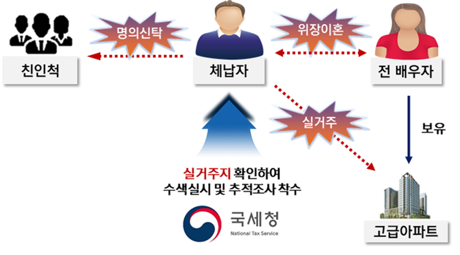 국세청은 체납자와 친‧인척의 소득‧소비 지출 등 빅데이터 분석을 통해 좁혀진 생활반경 내 가족들의 거주지 탐문을 통해 실거주지를 확인하여 수색 등 추적조사에 나섰다.
