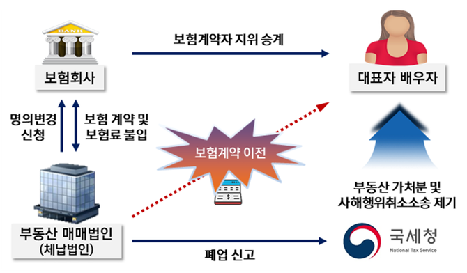 국세청은 해당 보험금에 가액배상을 청구하고, 배우자 소유의 부동산 등에 대해 가압류하여 재산을 보전한 후 사해행위취소 소송 제기하고 고발 등 범칙처분을 검토하고 있다.