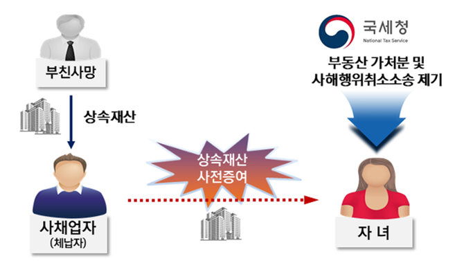 국세청은 자녀 소유 부동산에 대한 법원의 가처분 결정을 받아 재산을 보전한 후 자녀를 상대로 사해행위취소 소송을 진행 중이다.