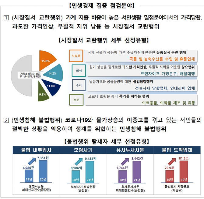 대상은 프랜차이즈와 배달대행 등 시장지배력을 이용한 가격담합, 과도한 가격인상 등 시장질서 교란행위로 폭리를 취하는 시장질서 교란행위 탈세자 47명, 과장광고 유사투자자문과 불법대부업 등서민들을 상대로 불법적 사익을 편취하는 탈세자 42명 등이다.