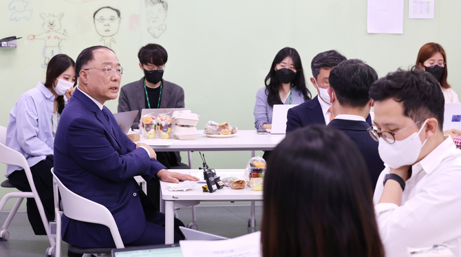 홍 부총리는 최근 급등세를 이어가고 있는 물가에 대해서는 "원유를 포함한 석유류 가격이 급등하며 물가를 안정시키기 쉽지 않은 상황"이라며 "민간 부문, 기업이 도와줘야 할 부분도 있다"고 지적했다.