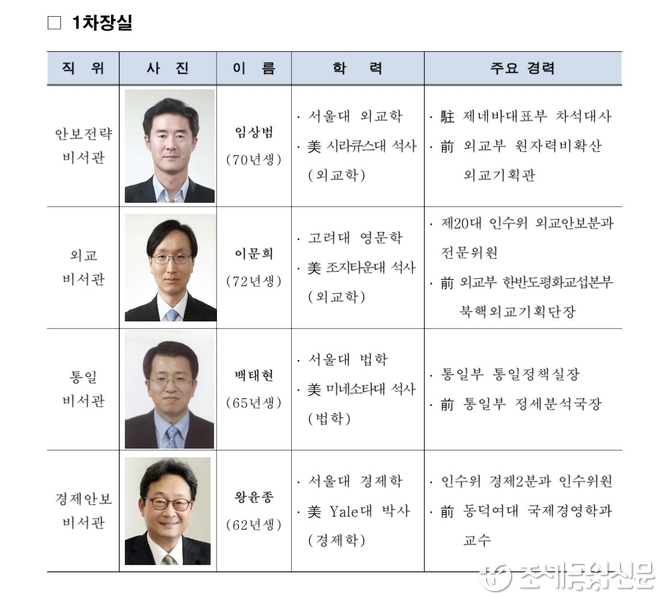 국가안보실 1차장실 내 안보전략비서관은 임상범 전 제네바대표부 차석대사가, 외교비서관은 이문희 제20대 인수위 외교안보분과 전문위원, 통일비서관은 백태현 통일부 통일정책실장, 경제안보비서관은 왕윤종 윈수위 경제2분과 인수위원이 발탁됐다.