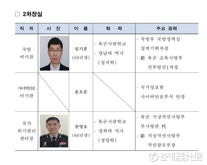 2차장실 국방비서관으로는 임기훈 국방부 국방정책실 정책기획차장이, 사이버안보비서관은 윤오준 국가정보원 사이버안보부서 단장, 국가위기관리센터장은 권영호 육군 지상작전사령부 부사령관이 배치됐다.