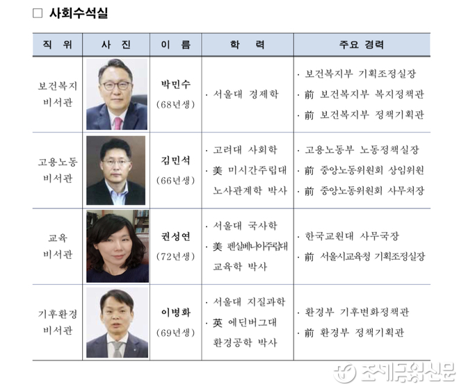 사회수석실은 각 분야에서 전문성을 갖춘 전현직 관료 출신으로 채워졌다. 박민수 보건복지부 기획조정실장이 보건복지비서관에 임명됐으며, 김민석 고용노동부 노동정책실장이 고용노동비서관, 권성연 한국교원대 사무국장이 교육비서관, 이병화 환경부 기후변화정책관이 기후환경비서관을 맡았다.