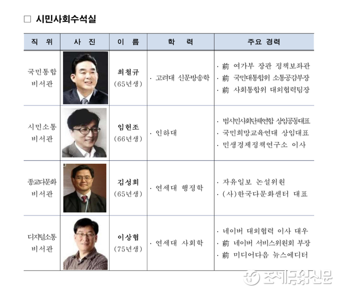 시민사회수석실 내 국민통합비서관은 최철규 전 여가부 장관 정책보좌관, 시민소통비서관은 임헌조 범시민사회단체연합 상임공동대표, 종교다문화비서관에는 김성회 자유일보 논설위원, 디지털소통비서관은 이상협 전 네이버 서비스위원회 부장이 낙점됐다.