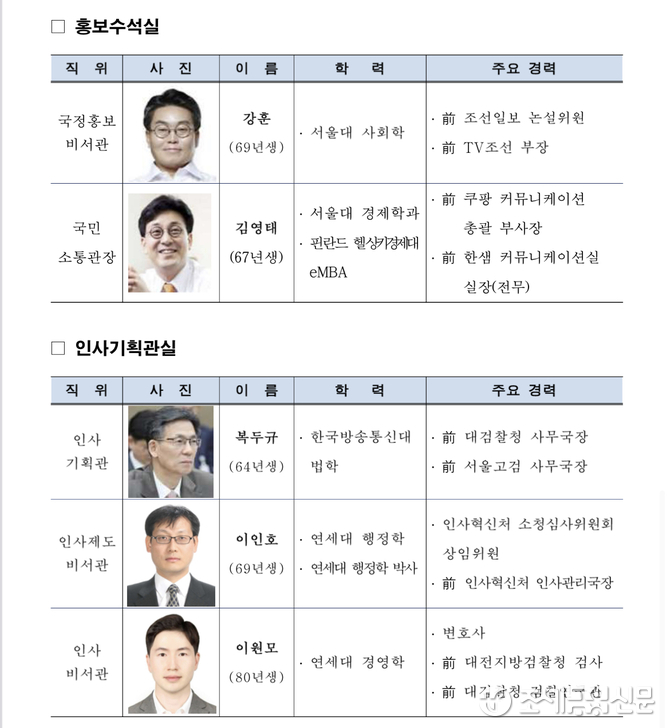 홍보수석실 내 국정홍보비서관은 강훈 전 조선일보 논설위원이, 국민소통관장은 김영태 전 쿠팡 커뮤니케이션 총괄 부사장이 임명됐다. 인사기획관실 인사기획관은 복두규 전 대검찰청 사무국장이, 인사제도 비서관은 이인호 인사혁신처 소청심사위원회 상임위원이, 인사비서관은 이원모 변호사가 맡는다.