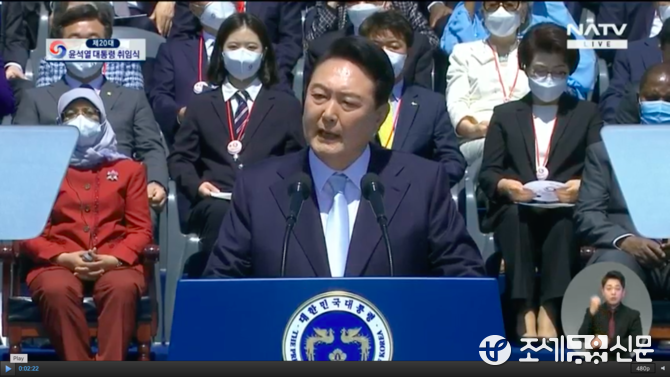 이날 자정부터 법적 임기가 시작된 윤 대통령은 취임사에서 “자유민주주의와 시장경제체제를 기반으로 국민이 진정한 주인인 나라로 재건하고, 국제사회에서 책임과 역할을 다하는 나라로 만들어야 하는 시대적 소명”이라고 집권 목표를 밝혔다.