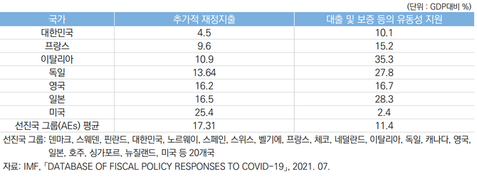 재정지출이 압도적으로 많은 미국을 제외하고 일본, 영국, 독일, 이탈리아, 프랑스 등 주요국의 GDP대비 직접 지원금은 13.4%, 저이자 대출은 24.7%였다. 미국과 한국을 포함하면 주요국 평균 직접 지원 비중은 17.31%, 저이자 대출 비중 11.4%였다.