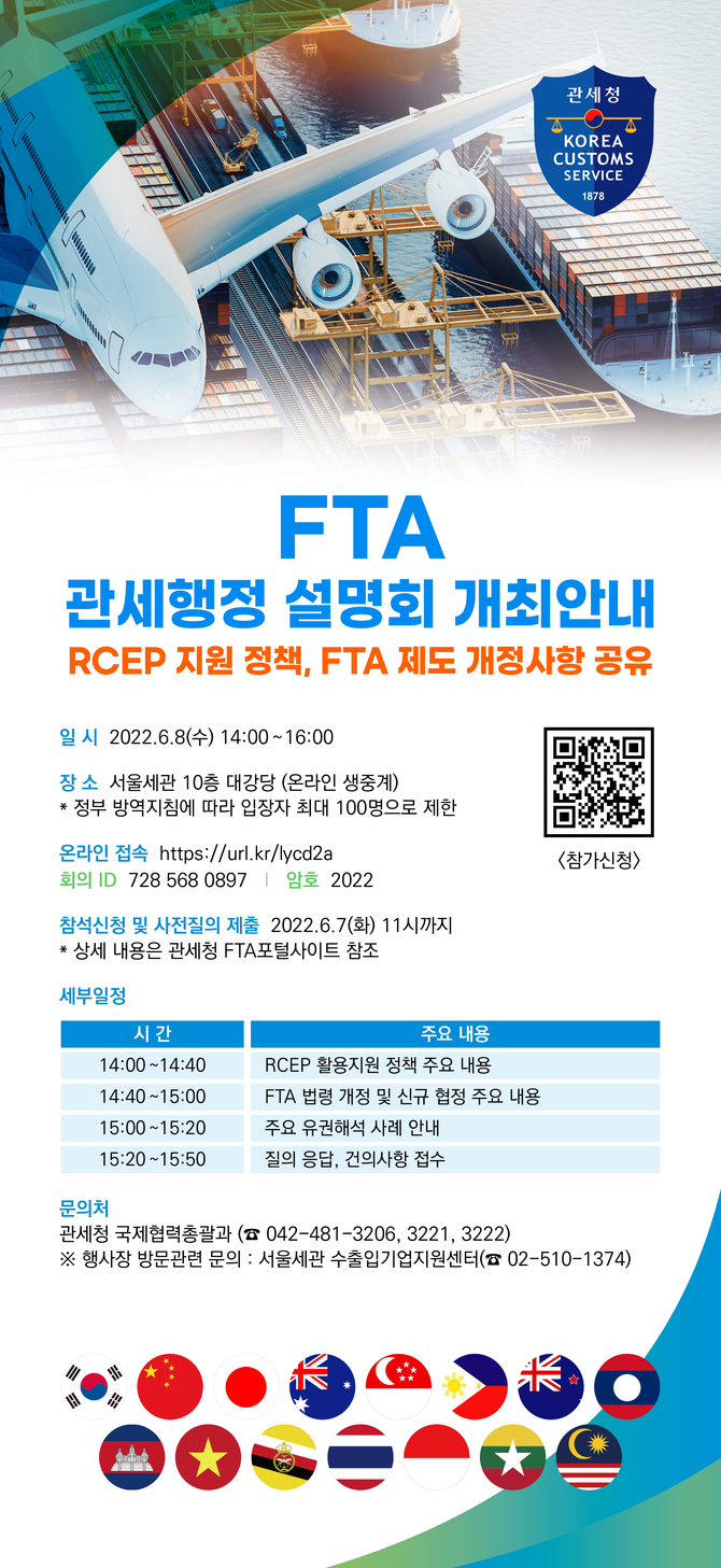 관세청은 이번 설명회를 통해 역내포괄적경제동반자협정(RCEP) 활용 지원을 위해 마련한 주요 정책과 함께 개정 법령, 신규 협정 주요내용 등 기업이 FTA를 활용할 때 반드시 알아야 할 제도 변경 사항을 안내한다.