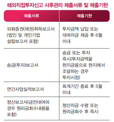해외직접투자신고한 개인이나 기업은 다음의 보고서 또는 서류를 정한 기일 내에 당해 신고기관의 장에게 제출하여야 한다.