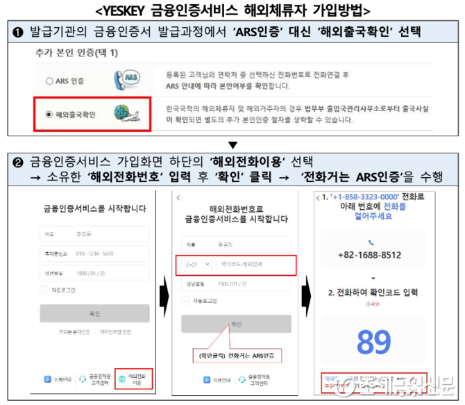 금융결제원이 이날부터 해외체류자를 위한 금융인증서비스를 개시, 국내 계좌개설 등 전자금융거래서비스에 가입한 재외국민은 국내 휴대전화 없이도 해외출국확인 및 해외전화번호 ARS인증으로 금융인증서 발급이 가능해졌기 때문이다.
